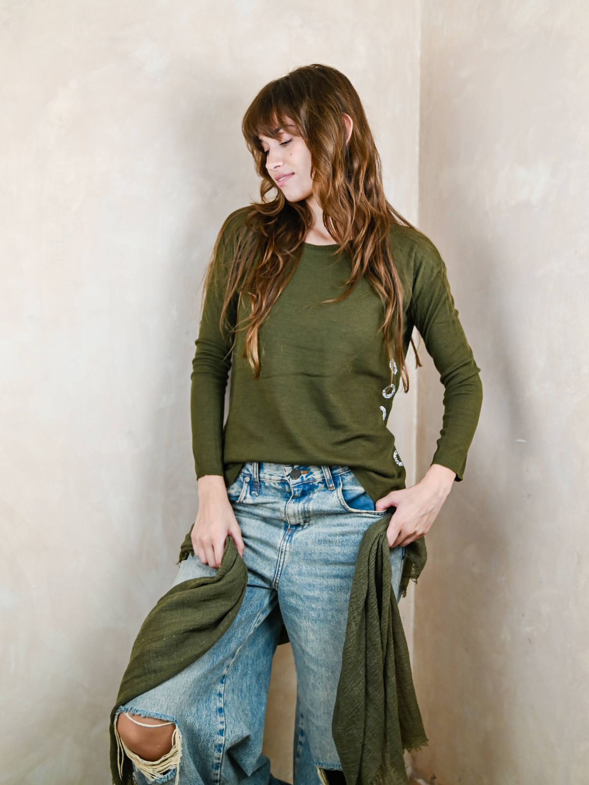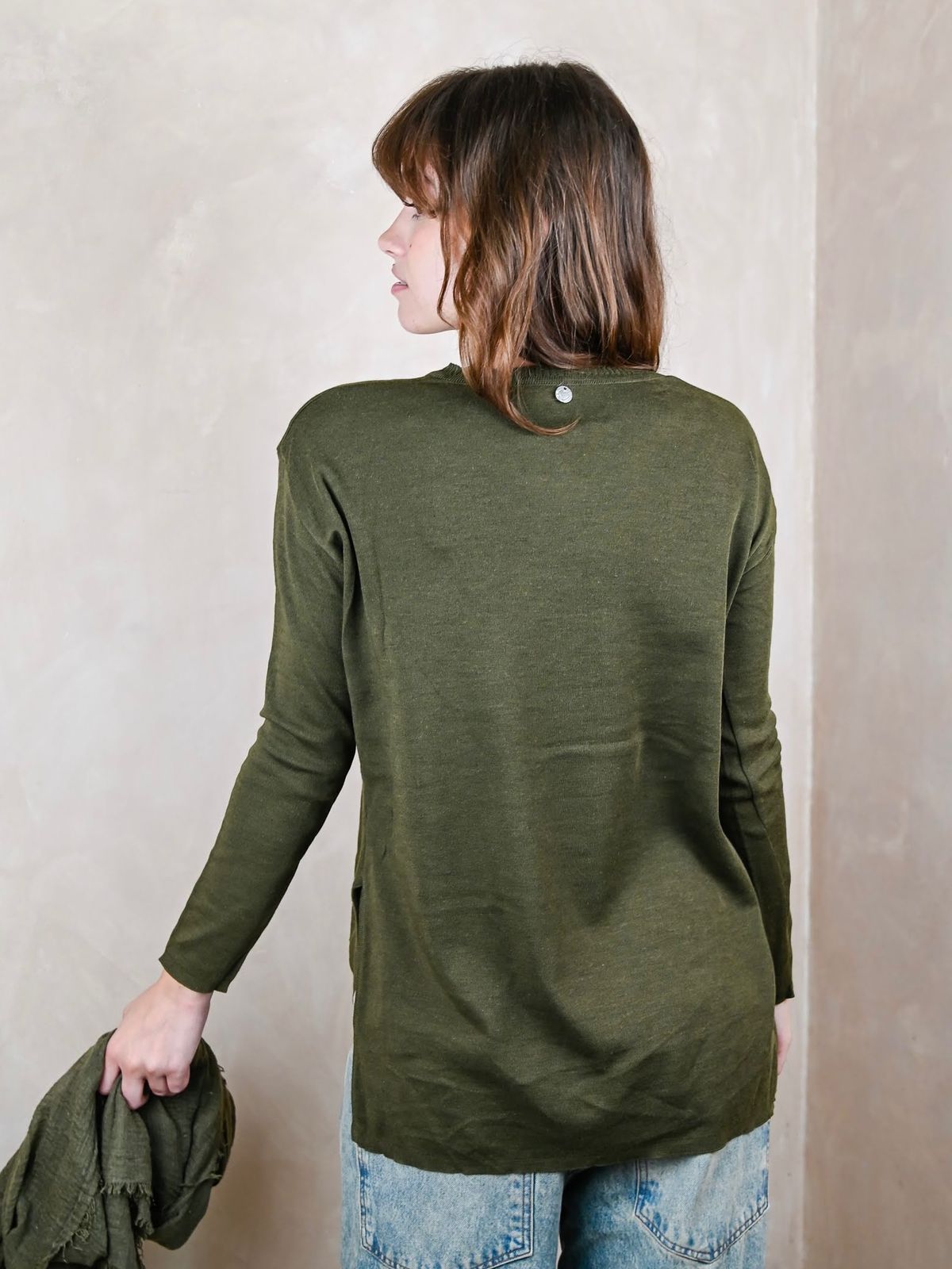 Sweaters de viscosa, mangas ajustadas, 8cm más largo atrás que adelante, con dos tajos.